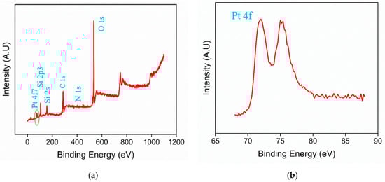 XPS analysis was further conducted on the PtNPs@NH2-VMSF/ITO electrode to determine its elemental composition. Figure 3a shows the XPS survey spectrum, which reveals significant peaks corresponding to O, Si, Pt, and N elements. Figure 3b presents the high-resolution Pt4f spectrum with two strong peaks observed at around 71.5 eV and 75.4 eV, confirming the presence of platinum. The results confirm the presence of amino-functionalized silica structures and deposited Pt nanoparticles in the PtNPs@NH2-VMSF modification layer.