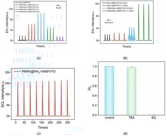 (a) ECL signal obtained on PtNPs/NH2-VMSF/ITO electrode prepared using different deposition times for the in situ synthesis of PtNPs. (b) ECL signal obtained on PtNPs/NH2-VMSF/ITO electrode under different potential ranges. (c) ECL signal under continuous CV scanning. (d) The relative ratio of ECL intensity in absence (I0) or presence (I) of different free radical scavengers.