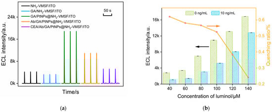The feasibility of immunosensor fabrication was examined by investigating the ECL signals of the obtained electrodes during the construction process. As shown in Figure 5a, the ECL signal of the luminol–H2O2 system on the NH2-VMSF/ITO electrode is low. The modification of GA on the outer surface of SM@NH2-VMSF and the following removal of SMs did not affect the ECL signal of the electrode. However, after the deposition of PtNPs inside the nanochannels, the ECL signal on the GA/PtNPs@NH2-VMSF/ITO electrode was significantly enhanced. This enhancement is attributed to the electrocatalytic production of ROS by PtNPs towards H2O2 at negative potentials, thereby enhancing the ECL of the luminol. The covalent immobilization of Abs and the blocking of nonspecific sites by BSA resulted in a decrease in the ECL signal of the fabricated immunosensor (Ab/GA/PtNPs@NH2-VMSF/ITO). Clearly, when Abs and the blocking BSA are immobilized on the outer surface of NH2-VMSF, they hinder the diffusion of luminol and H2O2. In the presence of CEA in the system, the ECL signal of the electrode further decreases. This reduction is attributed to the specific recognition of CEA by the immunorecognition interface. As the immunocomplexes formed on the outer surface of NH2-VMSF, also on the exit of the nanochannels, they significantly hindered the diffusion of small molecules to the electrode surface, resulting in decreased ECL intensity.