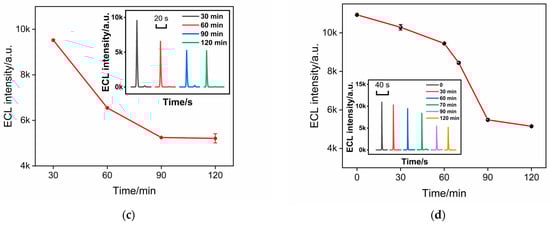 To achieve the highest sensitivity for the detection of CEA, the influence of antibody incubation time and CEA binding time on the performance of the immunosensor was also investigated. The ECL signal after the binding of CEA with immunosensors fabricated using different Ab immobilization times was investigated. As shown in Figure 6c, the ECL signal significantly decreased with the increase in the incubation time. After the antibody incubation time reached 90 min, the ECL signal reached a plateau. Thus, the antibody incubation time was chosen as 90 min in the subsequent experiments. In addition, when the CEA binding time with the immunorecognition interface reached 90 min, the ECL signal was the lowest. Thus, the binding time was set at 90 min.