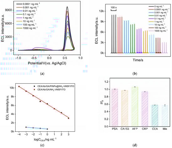 Under optimal detection conditions, the performance of the constructed immune sensor for detecting CEA was investigated. Figure 6a shows the ECL–potential plots obtained on the Ab/GA/PtNPs@NH2-VMSF/ITO electrodes in the presence of different concentrations of CEA. The ECL signal of the electrode after incubation with different concentrations of CEA is demonstrated in Figure 6b. As the CEA concentration increases, the number of immune complexes formed on the electrode surface increases. This leads to a stronger hindrance to the diffusion of the ECL emitters and co-reactants, resulting in a further decrease in the ECL signal of the electrode. Consequently, quantitative detection of CEA is achieved. Figure 6c shows the corresponding linear fitting curve. The results indicate a good linear relationship between the ECL signal (IECL) and the logarithm of CEA concentration (logCCEA) in the range of 0.1 pg mL−1 to 1000 ng mL−1 (IECL = −1015 logCCEA + 6261, R2 = 0.996). The limit of detection (LOD), calculated based on a signal-to-noise ratio (S/N) of 3, was determined to be 0.3 pg mL−1.