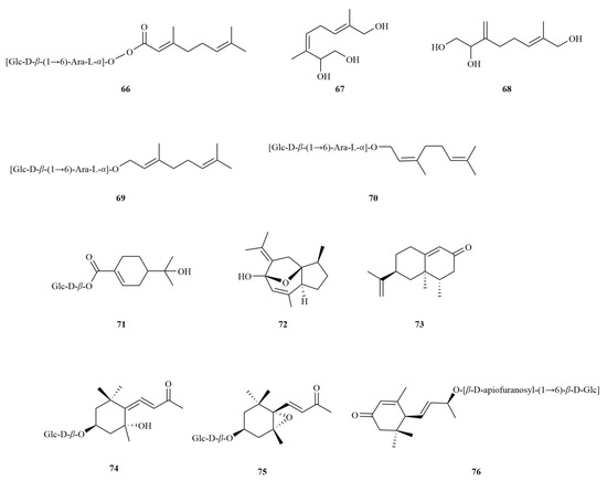 | 76 | (6R,7E,9R)-9-Hydorxy-4,7-megastigmadien-3-one-9-O-β-D-apiofuranosyl-(1–6)-β-D-glucopyranoside | C24H38O11 | 502.2414 | fruits | MS, 13C-NMR, 1H-NMR | [14] |