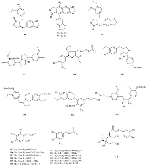 - Lee, D.Y.; Seo, K.H.; Jeong, R.H.; Lee, S.M.; Kim, G.S.; Noh, H.J.; Kim, S.Y.; Kim, G.W.; Kim, J.Y.; Baek, N.I. Anti-inflammatory lignans from the fruits of Acanthopanax sessiliflorus. Molecules 2013, 18, 41–49. [Google Scholar] [CrossRef]