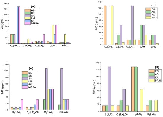 - Obłąk, E.; Piecuch, A.; Guz-Regner, K.; Dworniczek, E. Antibacterial activity of gemini quaternary ammonium salts. Microbiol. Lett. 2014, 350, 190–198. [Google Scholar] [CrossRef]