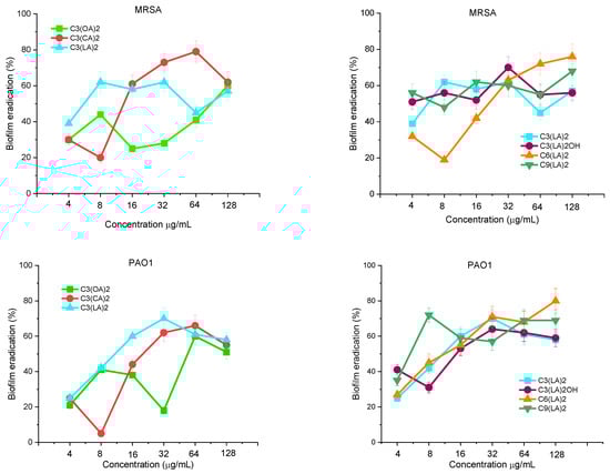 - Jennings, M.C.; Ator, L.E.; Paniak, T.J.; Minbiole, K.P.C.; Wuest, W.M. Biofilm-Eradicating Properties of Quaternary Ammonium Amphiphiles: Simple Mimics of Antimicrobial Peptides. ChemBioChem 2014, 15, 2211–2215. [Google Scholar] [CrossRef]