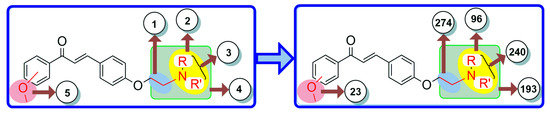 Scaffold morphing, a technique for drug designing, has been used for the design of novel chalcone molecules. It provides rationalized structural modifications within the parent molecule with improved physicochemical properties [67,68]. This study was carried out using the web server MolOpt (https://xundrug.cn/molopt accessed on 5 January 2021) recently developed web tool for scaffold morphing for bioisosteric transformation [69]. The transformation involves the replacement of the functional groups or other parts of the molecule with their bioisosteres on key molecules. By manually designing and ‘data mining’ an inbuilt module of MolOpt, the five replaceable sites of the designed chalcone compound were generated. The molecules that were produced were evaluated to determine if they could be feasibly synthesized. The feasibility of synthesis was rated from 1 (very easy) to 10 (very difficult), and a threshold of 2.5 was used to screen the molecules. The best molecules were then subjected to pharmacokinetic and molecular docking analyses using computational methods.
