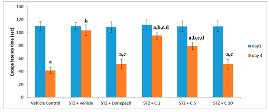 Evaluation of different interventions on ELT at days 1 and 4 employing MWM for memory evaluation. a p < 0.05 vs. day 1 escape latency of vehicle control group; b p < 0.05 vs. day 4 escape latency of vehicle control group; c p < 0.05 vs. day 4 escape latency of STZ + vehicle group; d p < 0.05 vs. day 4 escape latency of STZ + donepezil group.