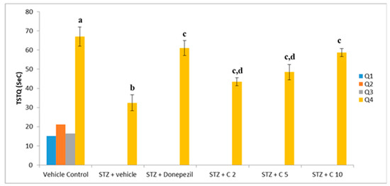 Effect of PS10 for TSTQ by rat in the MWM. a p < 0.05 vs. q1, q2 and q3 of vehicle control group; b p < 0.05 vs. q4 of vehicle control group; c p < 0.05 vs. q4 of STZ + vehicle group; d p < 0.05 vs. q4 of STZ + donepezil group.