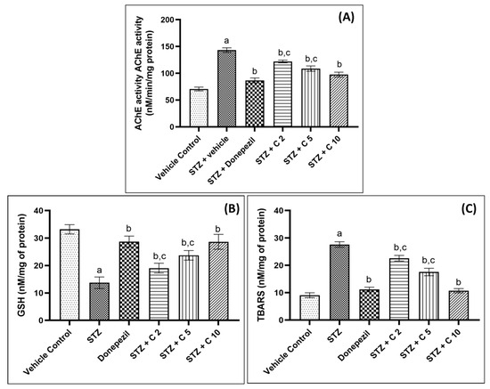 PS10′s effect on (A) brain AChE activity, (B) brain GSH level, and (C) brain TBARS levels of rats. a p < 0.05 vs. vehicle control; b p < 0.05 vs. STZ; c p < 0.05 vs. donepezil.