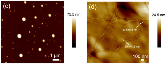 FL spectra of H-PO(Me)G-TPE (a) and H-PO(Et)G-TPE (b) in aqueous solutions of 0.2 mg·mL−1 at different pH conditions (T = 20 °C, λex = 325 nm), as well as AFM height images from assemblies of H-PO(Me)G-TPE in water at pH 5 with a concentration of 0.2 mg·mL−1 (c) and at pH 7 with a concentration of 0.04 mg·mL−1 (d). The arrows in (d) are indicators for measurement of the fiber widths.