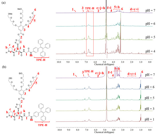 1H NMR spectra of H-PO(Me)G-TPE (a) and H-PO(Et)G-TPE (b) in D2O at different pH conditions. T = 25 °C, C = 1.0 mg·mL−1.