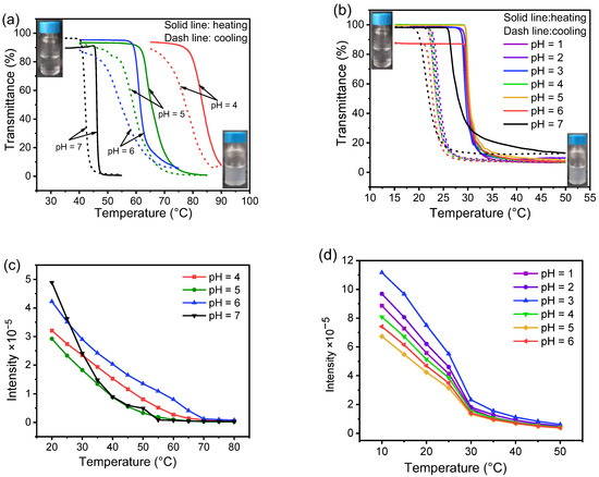 Plots of transmittance vs. temperature for H-PO(Me)G-TPE (a) and H-PO(Et)G-TPE (b) assemblies (C = 1.0 mg·mL−1, λ = 700 nm), as well as plots of FL intensities at 480 nm vs. temperature for H-PO(Me)G-TPE (c) and H-PO(Et)G-TPE (d) assemblies (C = 0.2 mg·mL−1. λex = 325 nm). Heating rate = 5 °C·min−1. Insets in (a,b): photographs of the solutions at different temperatures.