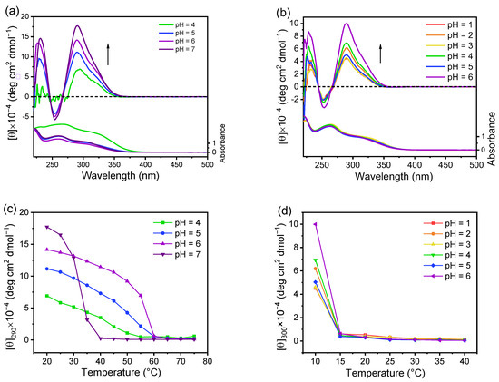 CD-UV spectra of assemblies from H-PO(Me)G-TPE (a) and H-PO(Et)G-TPE (b) in aqueous solutions at different pH conditions, as well as plots of [q]292 vs. temperature for assemblies from H-PO(Me)G-TPE (c) and H-PO(Et)G-TPE (d) in aqueous solutions at different pH conditions. C = 1.0 mg·mL−1. Heating rate = 2.0 °C.