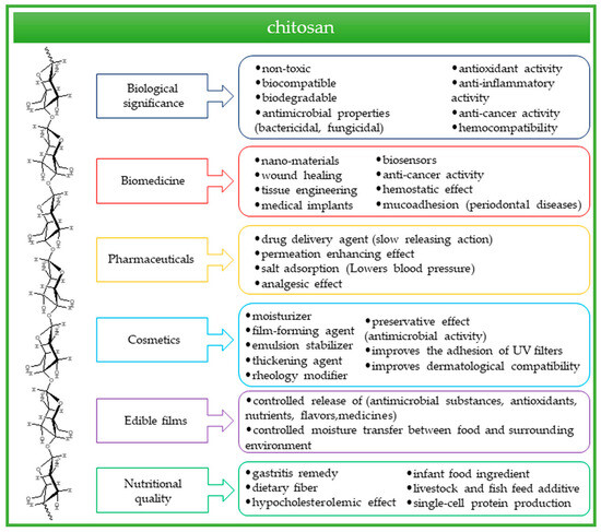 Chitosan is a linear polyaminosaccharide obtained in the process of chemical or enzymatic deacetylation of chitin. It is a biologically derived raw material and the second most common polymer after cellulose. Chitosan is well-known for its applicability as a biocompatible, biodegradable and non-toxic material for biomedical, food-related, supplemental and cosmetic use [1,2,3,4]. The unique properties of chitosan result from the presence of amine and hydroxyl functional groups in its structure [3,4,5]. Its special features and biological activity, including antimicrobial, antioxidant, anti-cancer, anti-inflammatory, hemocompatible and hemostatic properties, also result from its chemical structure and make it an excellent raw material for biomedical applications [6,7] (Figure 1).