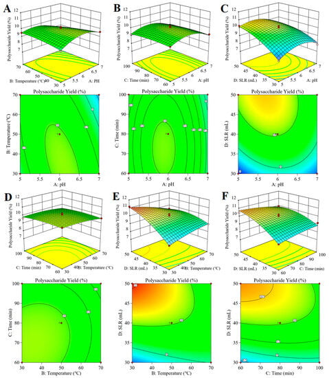 The 3D response surface plots and contour plots (A–F) of the influence of interactions of various factors on the extraction rate of ASPS. Note: SLR is the solid–liquid ratio.
