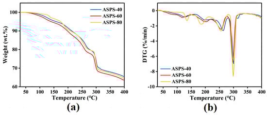 TGA (a) and DTG (b) analysis images of ASPS−40, ASPS−60, and ASPS−80.