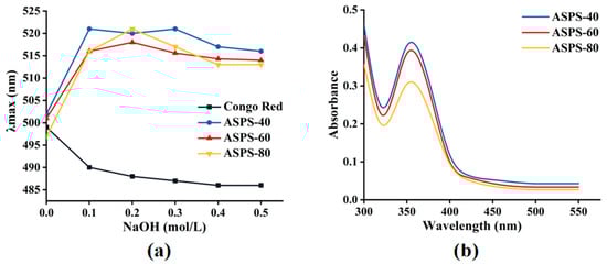 Structural characterization of ASPS−40, ASPS−60, and ASPS−80. (a) The λmax of Congo red + polysaccharides at various NaOH concentrations; (b) UV−vis spectrum in the presence of I2−KI.