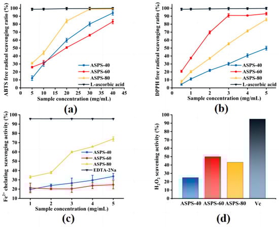 Antioxidant test of ASPS−40, ASPS−60, and ASPS−80. (a) ABTS radical scavenging activities; (b) DPPH radical scavenging activities; (c) H2O2 radical scavenging activities; (d) Fe2+ chelating activities.