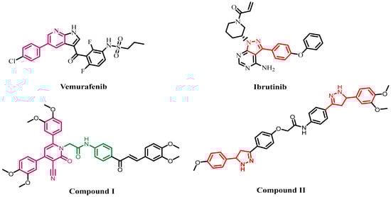 Structures of vemurafenib, Ibrutinib, compound I, and II.