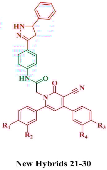 Based on the observed results, the structure–activity relationship of our novel pyridone/pyrazoline hybrids (21–30) is as follows: