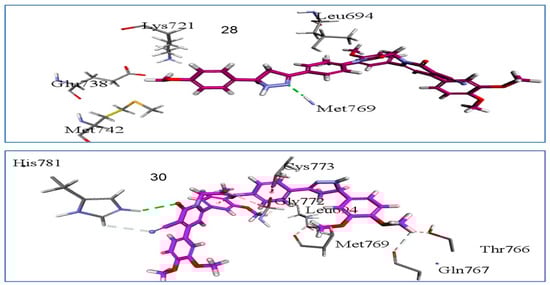 Utilizing in silico molecular docking simulation models, we tested compounds 28 and 30 against the EGFR and BRAFV600E [] proteins. The objective was to determine the binding affinity and elucidate the inhibition mechanisms of the most potent compounds (28, 30) with potential cellular targets within this class. The results yielded a promising outlook throughout the assessment of cellular macromolecules employed in this investigation. Employing the Discovery Studio program, we conducted molecular docking studies involving crystal structures to investigate the binding modes of the EGFR (PDB ID: 1M17) [] and BRAFV600E (BRAFm; PDB ID: 3OG7) [].