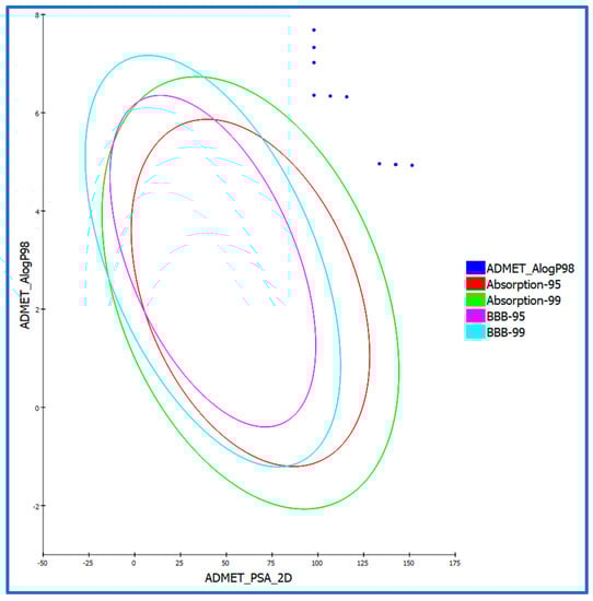 In the ADMET assessment, all the newly synthesized hybrids were situated at a blood–brain barrier (BBB) level of 4, effectively preventing their penetration across the BBB. Notably, drug bioavailability was linked with the fundamental property of the 2D polar surface area (ADMET 2D PSA). Employing the calculated 2D polar surface area (PSA 2D) and atom-based Log P98 (A log P98) properties, the outcomes were visualized in the form of a 2D ADMET plot (Figure 6). Notably, molecules possessing a PSA of >145 generally exhibit low bioavailability and passive absorption characteristics []. Employing a 2D chemical structure as input, the model for cytochrome P450 2D6 (CYP2D6) predicts the inhibition potential of the CYP2D6 enzyme. The liver enzyme CYP2D6 plays a pivotal role in the metabolism of numerous substrates, contributing significantly to most drug–drug interaction scenarios []. Consequently, an experiment to assess CYP2D6 inhibition is imperative within the regulatory protocols employed during drug discovery and development []. Every assessed hybrid compound was predicted to exhibit non-inhibitory behavior towards CYP2D6. Consequently, the likelihood of inducing liver dysfunction after administering these hybrids is minimal.