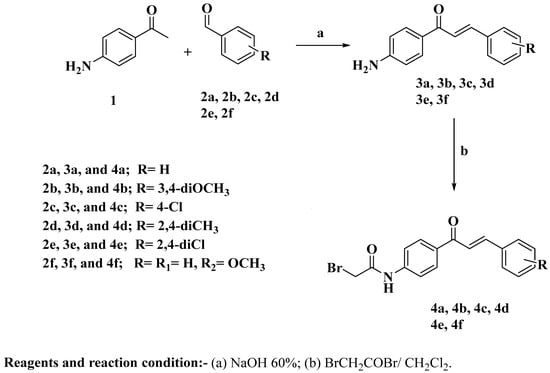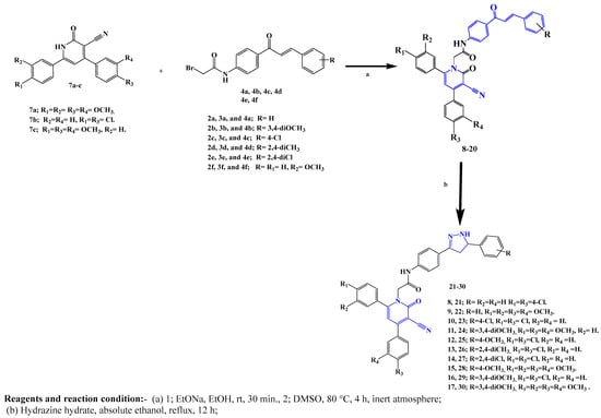 The synthetic procedures for the intermediates 4a–f, 7a–c, and the target 3-cyanopyridone–pyrazoline novel hybrids 21–30 are described in Scheme 1, Scheme 2 and Scheme 3. Shown in Scheme 1, compounds 3a–f were synthesized through a base-catalyzed Claisen–Schmidt condensation of 4-aminoacetophenone 1 with substituted benzaldehyde derivatives 2a–f []. Chalcones 3a–f were reacted with bromoacetyl bromide in a potassium carbonate solution in dichloromethane to produce the acetylated chalcones 4a–f [].