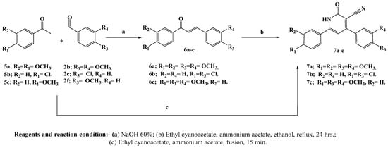 The key intermediates, 3-cyano-4,6-bis(phenyl)-pyridones 7a–c, were efficiently synthesized using a one-pot four-component reaction without any solvent. Equimolar amounts of the appropriately substituted benzaldehydes 2b, 2c, or 2f; the substituted acetophenones 5a, 5b, or 5c; ethyl cyanoacetate; and ammonium acetate were directly stirred at 110 °C for 10–15 min, resulting in the formation of the target compounds in high yields (Scheme 2) []. The sequential two-step reaction, which involved condensing benzaldehydes with acetophenones and then treating the resulting chalcones with ethyl cyanoacetate and excess ammonium acetate, resulted in a lower yield and a more time-consuming process. This observation highlights the advantage of the one-pot, four-component reaction used in this study, which provided a more efficient and time-saving method for synthesizing the desired compounds [].