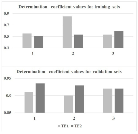 The best model is observed for TF1 (split-1); however, the results for the other two splits in the case of the TF1-model are worse, and the variance of the coefficient of determination for the validation set is significant. In contrast, the average value of the coefficient of determination for the validation set in the case of the TF2-model is more significant, and the variance is less than those in the case of the TF1-model. Thus, despite the excellent result for split-1 with the TF1-model, on the whole, TF2-model is the preferable model.