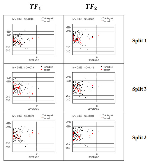 Williams plots for all considered models indicated that there are practically no outliers for both TF1-models and TF2-models (Figure 3).