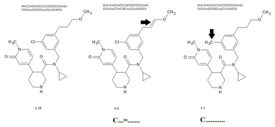 There are stable promoters of the pIC50 increase related to all distributions. For instance, the promoters of an increase of pIC50 are the presence of nitrogen connected with carbon when Morgan extended connectivity of carbon atoms is equal to 5, 6, and 7 or Morgan extended connectivity of nitrogen atoms equals 4. In contrast, promoters of decrease of pIC50 are vertex degrees of carbon atoms equal to 2 or 3 and degrees of nitrogen atoms equal to 2. Some other features become promoters of an increase or decrease of cardiotoxicity (Table 3).