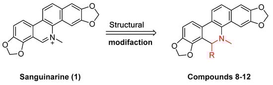 Existing research has confirmed that the hydroxymethyl group at the C-6 position of benzophenanthridine alkaloids takes on a critical significance to cellular activity, and the introduction of different groups at the C-6 position can change their activity (Figure 3 and Figure 4) [45]. For instance, the introduction of malonate, dialkylphosphite, and nitroalkanes significantly enhances their cytotoxicity. Furthermore, derivatives (8–12) (Table 1) obtained after the insertion of the electron-donating group at the C-6 position by sanguinarine exhibit higher cellular activity than those of chelerythrine (13–16) (Table 2).