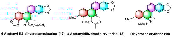 The 6-acetyl-5,6-dihydrosanguinarine (17), 8-acetyldihydrochelerythrine (18), and dihydrochelerythrine (19) (Figure 5) are isolated from Corydalis saxicola Bunting, and the above alkaloids have some antitumor effects on squamous cell carcinoma, lung cancer, and liver cancer of the tongue. To be specific, the mechanism of action against human tongue squamous cell carcinoma may be inhibiting NF-κB activation, downregulating BcI-2 protein expression on mRNA, and reducing telomerase activity; inhibiting non-small cell lung cancer A549 cell proliferation, migration, and inducing apoptosis; inhibiting proliferation and migration and upregulating the intracellular NF-κB p65 expression of the subunit [51].