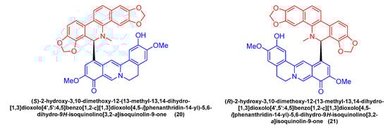Feng Qin et al. [52] extracted and isolated two novel dimeric benzophenanthridine alkaloids (20, 21) (Figure 6) from Corydalis saxicola, which comprised a mixture of benzophenanthridine and protoberberine passing between the 6, 12 C-C σ Bond direct coupling generation. Compounds 20 and 21 inhibited T24 cells with IC50 values of 13.26 μM and 9.45 μM.