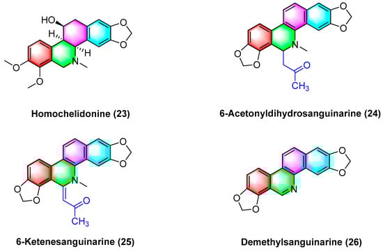 Acetyldihydrosanguinarine (24), 6-ketenesanguinarine (25), and demethylsanguinarine (26) (Figure 8) are isolated from Corydalis bungeana Turcz. Xiyun Ye et al. [62] determined the cytotoxic activity of the above two compounds against A549, HT-29, kb16, and P-388 cell lines, respectively, and their ED50 (μg/mL) values reach 1.840, 1.600, 0.340, and 0.051, respectively.