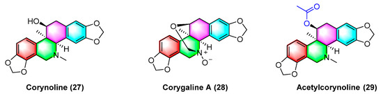 Corygaline A (28) (Figure 9), isolated from Corydalis bungeana Turcz, refers to a hexahydrobenzophenanthridine alkaloid with an unusual carbon skeleton. Corygaline A (28) is capable of inhibiting the NO production in LPS-activated RAW264.7 macrophages with an IC50 value of 2.9 μM. Moreover, it is independent of dose [64].