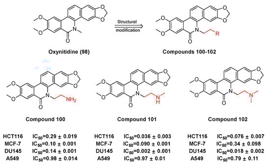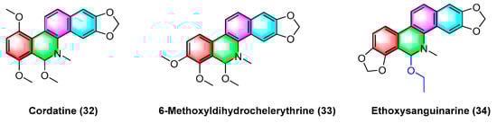 The benzophenanthridine alkaloids cordatine (32) and 6-methoxyldihydrochelerythrine (33) in Figure 11 are extracted from the fruits of Macleaya cordata. Hui Liang Zou et al. [67] determined the cytotoxic activity of the above two benzophenanthridine alkaloids against MCF-7 and SF-268 through the MTT assay. As revealed by the results, the IC50 value of cordatine (32) against MCF-7 cells is 34.78 mM, and that against SF-268 cells reaches 11.79 mM. Furthermore, the IC50 value of 6-methoxydihydrochelerythrine (33) reaches 21.45 mM and 4.28 mM, respectively.