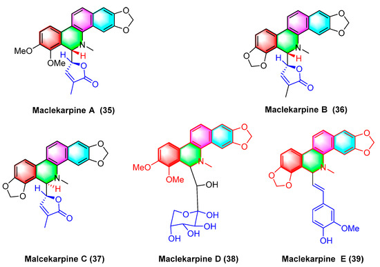 Five dihydrodibenzophenanthridine alkaloids, termed maclekarpine A–E (35–39) (Figure 12), are isolated from the fall back roots of Macleaya cordata. The alkaloids maclekarpine A–E (35–39) exhibit high antitumor activity and have an inhibitory effect on several human cancer cells (e.g., human colon cancer cell line HCT-8, human hepatoma cell line BEL-7402, human gastric cancer cell line BGC-823, human ovarian cancer cell line A2780, as well as human lung cancer cell line A549). Maclekarpine A (35) exhibits excellent activity against BGC-823 with an IC50 value of 0.7 μM, except that maclekarpine B (36) is inactive. The IC50 value of maclekarpine C (37) ranges from 1.6 to 3.4 μM. Maclekarpine D (38) IC50 values range from 0.2 to 2.0 μM. Maclekarpine E (39) has a significant inhibitory activity against BGC-823 with the IC50 value of 0.1 μM [70].
