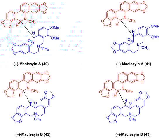 (±)-macleayin A (40, 41) and (±)-macleayin B (42, 43) in Figure 13 originating from Macleaya cordata (Willd.) r. br. are enantiomeric natural dimeric alkaloids. (±)-macleayin A (40, 41) are prepared by coupling dihydrosanguinarine with allocryptamine through the 6,13′-C-C bond, and (±)-macleayin B (42, 43) are synthesized by coupling dihydrosanguinarine with proto opioid through a 6,13′-C-C bond. In the in vitro activity test, (±)-macleayin A and (±)-macleayin B have significant inhibitory effects on cancer cell HL-60 with IC50 values from 3.51 to 9.64 μM. Macleayin A exhibits the optimal activity, while the IC50 values of sanguinarine and allocryptophylline reach 7.71 and 7.18 μM, respectively [71].