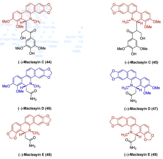 The natural benzophenanthridine alkaloids (−)-macleayin C (44), (+)-macleayin C (45), (−)-macleayin D (46), (+)-macleayin D (47), (−)-macleayin E (48), and (+)-macleayin E (49) (Figure 14) with enantiomers originate from Macleaya cordata. They are novel compounds comprising dihydrophenanthridine alkaloids with phenylpropane. Among the cytotoxic activities, (−)-macleayin C (44) and (+)-macleayin C (45) are more active against HL-60 cancer cells with IC50 values of 12.13 and 10.15 μM, respectively. (−)-macleayin D (46), (+)-macleayin D (47), (−)-macleayin E (48), and (+)-macleayin E (49) significantly inhibit HL-60 and A549 cancer cells with IC50 values from 18.46 to 35.26 μM [72].