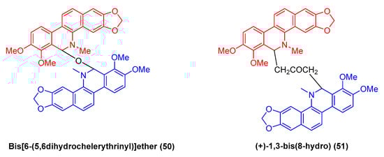 Bis-[6-(5,6dihydrochelerythrinyl)] ether (50) (Figure 15) refers to a benzophenanthridine benzophenanthridine alkaloid dimer originating from the roots of M. microcarpa. It exhibits favorable cytotoxic activity against human cancer cell lines (e.g., HCT-8, BEL-7402, BGC-823, and A2780) with IC50 values of 1.6, 2.1, 0.1, and 1.6 μM, respectively [43]. Moreover, existing research has indicated that the natural benzophenanthridine dimeric alkaloid (+)-1,3-bis (8-hydro) (51) exhibits antitumor activity [73].