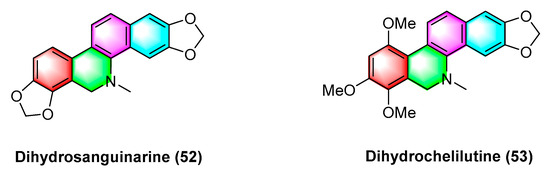 Jie Jiang et al. [74] isolated and extracted two benzophenanthridine alkaloids with anticancer activity dihydrosanguinarine (52) and dihydrochelilutine (53) (Figure 16) from Thalictrum microgynum Lecoy ex Oliv. Dihydrosanguinarine (52) inhibits pancreatic cancer cells by downregulating mut-p53 or wt-p53 protein expression and regulating the RAS/Raf/MEK/ERK pathway, and the mechanism may be correlated with inducing apoptosis in PANC-1 and SW1990 cells and triggering cell cycle arrest in PANC-1 cells [75]. Dihydrosanguinarine (52) at 5 μM concentration significantly inhibits human promyelocytic leukemia HL-60 cells with p < 0.001 while reducing cell survival [76].