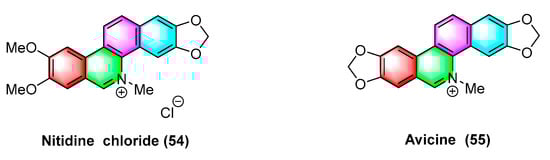 Avicine (55) and nitidine chloride (54) (Figure 17) are two types of benzophenanthridine alkaloids derived from the roots of Zanthoxylum avicennae that serve as cholinesterases (AChE), monoamine oxidases A (Maos), and A β 1–42 targeted inhibitors. Erika Plaza et al. [79] analyzed the IC50 values for inhibiting EeAChEH, rAChE, EqAChE, MAO A, and MAO B using avicine (55) and nitidine chloride (54). The IC50 values (μM) of avicine-inhibited AChEW as 0.15 ± 0.01, 0.52 ± 0.05, and 0.88 ± 0.08 reach 0.41 ± 0.02, and the inhibition Maos IC50 values (>100 μM). However, the IC50 values (μM) of nitidine chloride-inhibited AChE reach 0.65 ± 0.09, 1.25 ± 0.09, and 5.73 ± 0.60, and those of inhibition MAOs IC50 values reach 1.89 ± 0.17 and >300 μM.