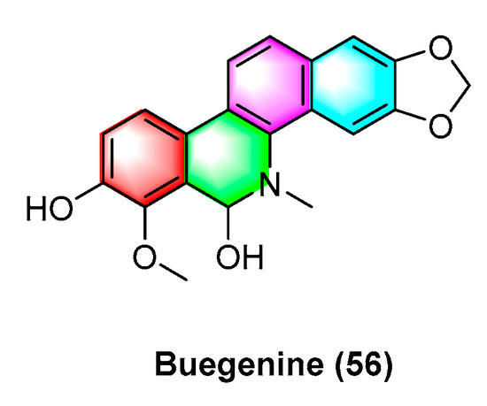 Buegenine (56) (Figure 18), derived from Zanthoxylum buesgenii, is cytotoxic in nine cancer cell lines, including leukemic cancer cells CCRF-CEM and CEM/ADR5000, breast cancer cell MDA-MB231 and its resistant subline MDA-MB231/BCRP, colon cancer cell HCT-116p53+/+ and its resistant subline HCT-116p53−/−, glioblastoma U87MG and its resistant subline U87MGΔEGFR, HepG2 hepatoma cells, and AML12 normal liver cells. It exhibits high activity with IC50 values less than 65 μM. Notably, buegenine (56) exhibits better activity against drug-resistant CEM/ADR5000 cell lines than doxorubicin [94].