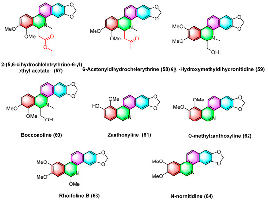 A wide variety of benzophenanthridine alkaloids (Figure 19) have been extracted by Deng, Y’s group [95] in Zanthoxylum avicennae from Yunnan Province, and their antileukemic cell line HLa activity in vitro is determined, with better activity of bocconoline (60), zanthoxyline (61), nitidine chloride (54), chelerythrine (2), and their IC50 values (μM) in the order of 7.65 ± 0.11, 24.94 ± 1.99, 3.59 ± 0.82, and 15.52 ± 0.26. Nitidine chloride (54) results in significant S-phase arrest and induces apoptosis in HEL cells, thus becoming a promising potential antileukemic candidate. Furthermore, other alkaloids 2-(5,6-dihydrochelerythrine-6-ylethyl acetate) (57), 6-acetonydihy–drochelerythrine (58), the activities of 6 β-hydroxymethyldihydronitidine (59), o-methylzanthoxyline (62), rhoifoline B (63), and n-nornitidine (64) are less weak with IC50 values higher than 30 μM.