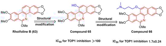 The natural product rhoifoline B (63) is structurally modified to obtain compound 65 (Figure 20) with the hydroxy substitutions at the 11-position. Compound 66 (Figure 20), originating from compound 65 through structural modification, enhances the inhibition selectivity of tyrosine DNA phosphodiesterase 1 (TDP1), with an IC50 value of 1.7 ± 0.24 μM. It is also capable of inhibiting the enhancement of DNA topoisomerase IB (TOP1) activity, thus effectively inhibiting MCF7, A549, H460, and HepG2 cells. The structure–activity relationship study indicates that the 11 hydroxyl groups of compound 65 are replaced by different chemical structures. For instance, compounds with triazole branched chains exhibit poor activity, which may be correlated with poor cell permeability [96].