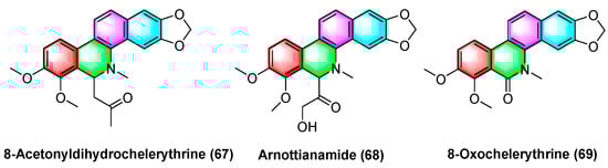 In Figure 21, the benzophenanthridine alkaloids 8-acetyldihydrocheleryrhtine (67), arnottianamide (68), and 8-oxochelerythrine (69) with anticancer effects are extracted and isolated from Zanthoxylum paracanthum kokwaro. Several studies have found that 8-acetyldihydrocheleryrhtine (67), arnottianamide (68), and 8-oxochelerythrine (69) can inhibit human breast cancer cell line HCC-1395 and human prostate cancer cell DU 145. The IC50 value for 8-acetyldihydrochelerythrine (67) reaches 9.99 μg/mL and 66.82 μg/mL. To be specific, the IC50 value of zanthoxylamide (68) reaches 38.34 μg/mL and 84.31 μg/mL. The IC50 value of 8-oxovalerythrine (69) reaches 14.09 μg/mL and 63.41 μg/mL [97].