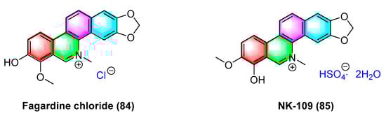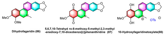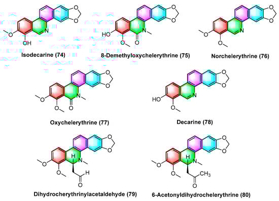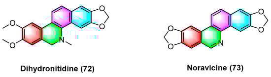 Two benzophenanthridine alkaloids with cytotoxic activity against a variety of human cancer cell strains, zanthocadinanine C (70) and 7-methoxy-8-demethoxynitidine (71) (Figure 22), are isolated from the traditional drug Zanthoxylum nitidum (Roxb.) DC. Zanthocadinanine C (70) and 7-methoxy-8-demethoxynitidine (71) exhibit cytotoxic activity against five human cancer cell lines KB, MCF-7, LNCaP, HepG-2, and lu-1, whereas the alkaloid 7-methoxy-8-demethoxynitidine (71) has high activity with IC50 values from 10.3 to 12.6 μM. Furthermore, zanthocadinanine C (70) is less active with IC50 > 100 μM [98].