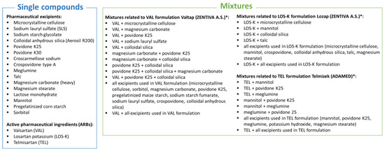 Single compounds and various types of mixtures investigated in this study. * Mixtures with APIs contain excipients that are actually present in the commercial formulations (Valtap, Lozap, Telmizek).
