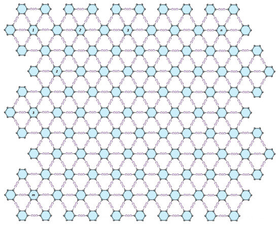 In this particular section, we provide an extensive examination of the structure, edge partition technique, and the novel computational results and findings associated with them. Our focus lies on measuring the distance-degree-based topological indices of the -graphyne. The detailed structure of -graphyne [9,33] is shown in Figure 2 and Figure 3. In each row, the number of vertices is and the number of edges is . The degree of a vertex by a distance of two is denoted by , which is the number of vertices that are adjacent to by the distance of two. The edge partition is shown below: